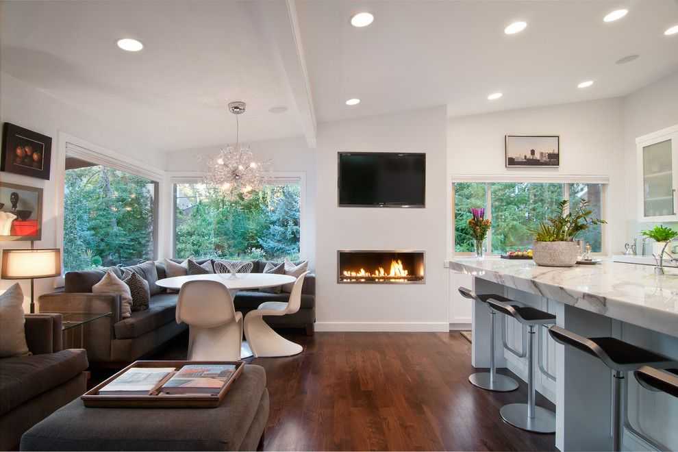 В современных интерьерах телевизор и камин – злостные антагонисты, отстаивающие главную роль в помещении, привлекая внимание на себя. Оптимальный выход из ситуации – зонирование гостиной с помощью мягкой мебели, разведя телевизор и камин на противоположные стороны