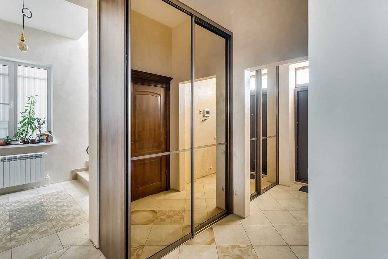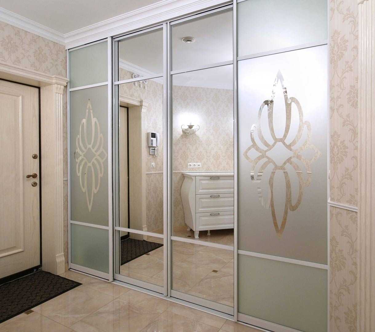 - Зеркальные дверцы — визуально расширяют небольшие помещения, делают их светлее. Те же функции выполняют стекла с пленкой или матовым орнаментом, витражи.