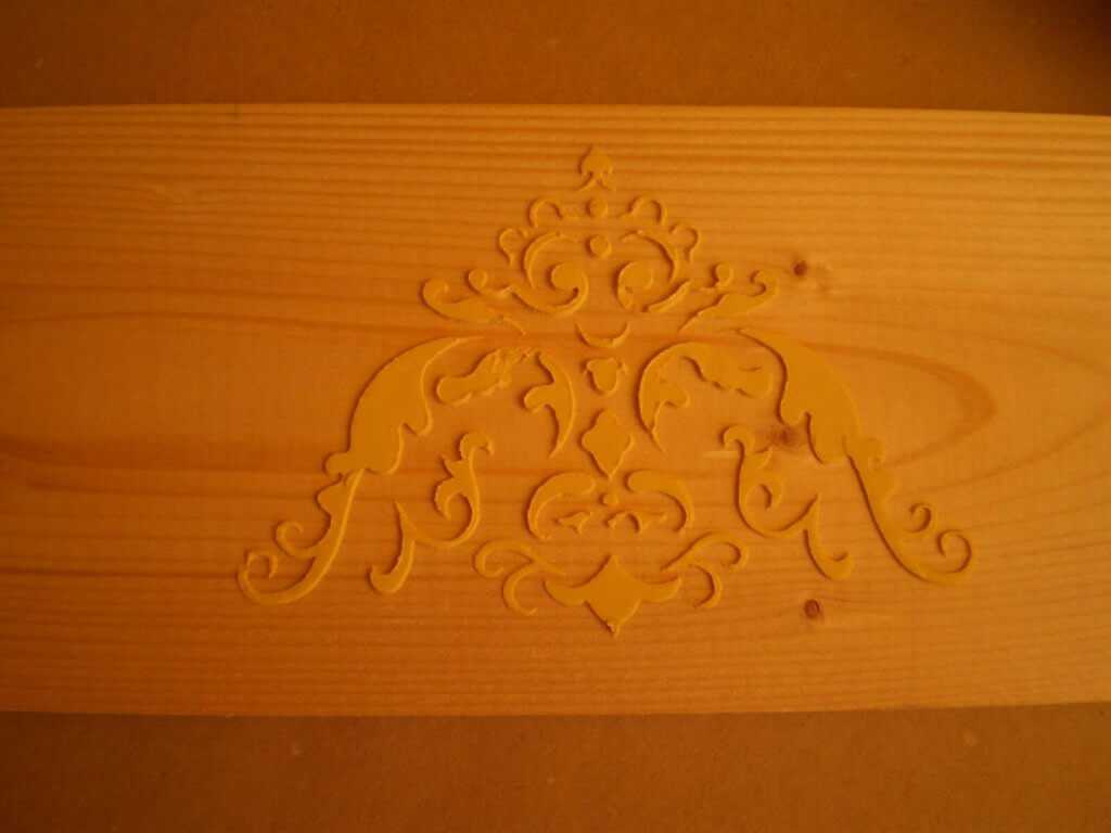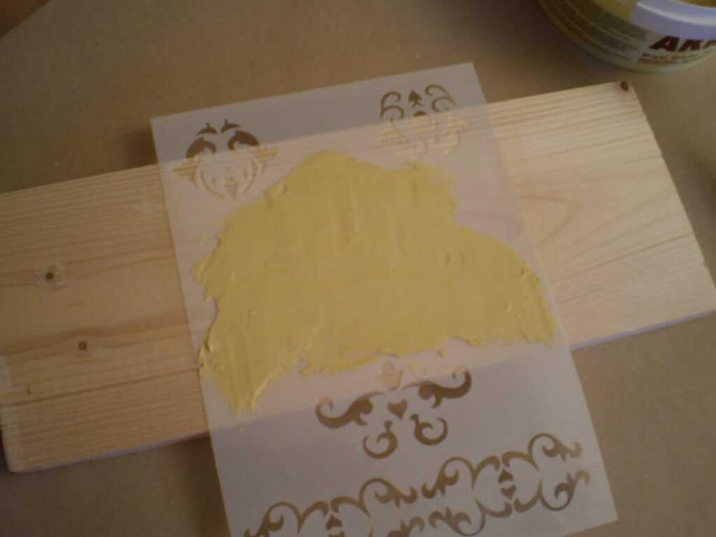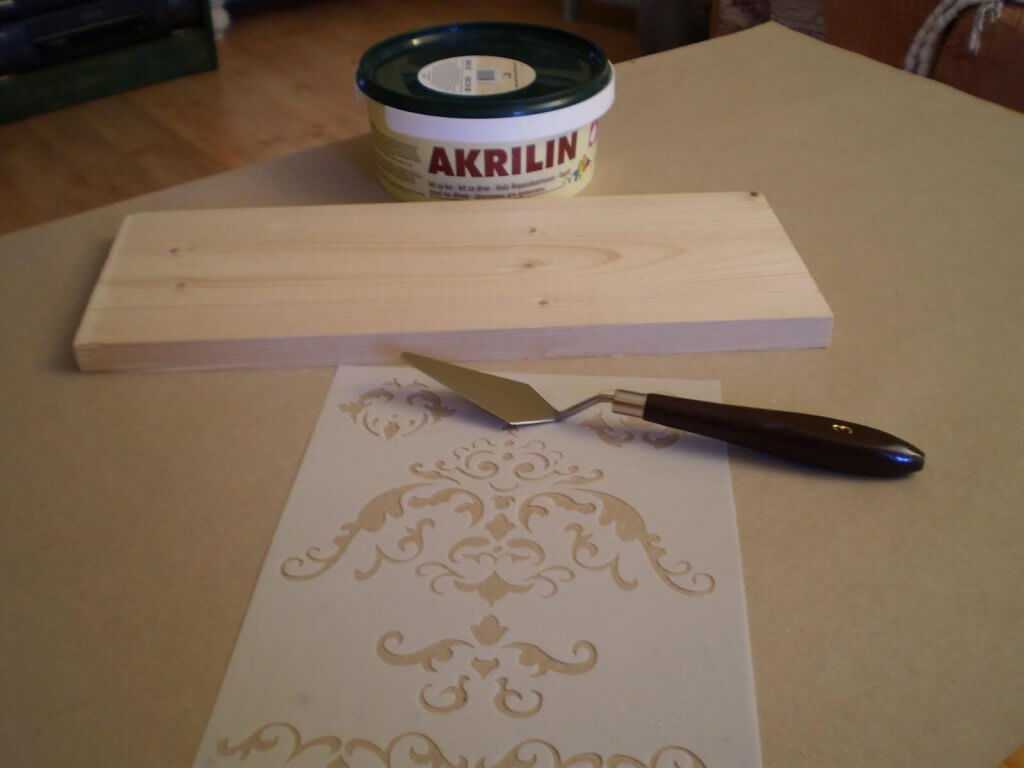 Закрепляем трафарет на поверхности дерева, закрепив его скотчем. Накладываем шпаклёвку на трафарет, поверхность выравниваем шпателем. Затем двумя руками снимаем трафарет, и оставляем работу до высыхания.