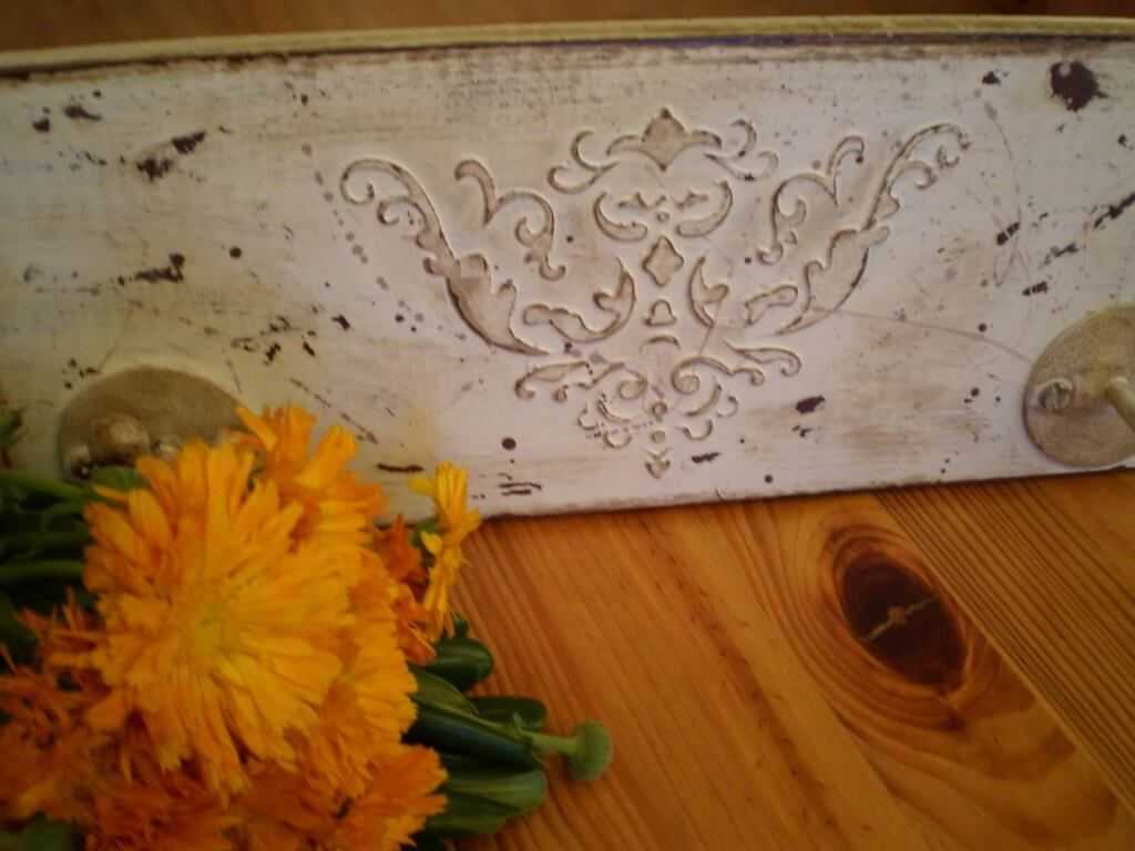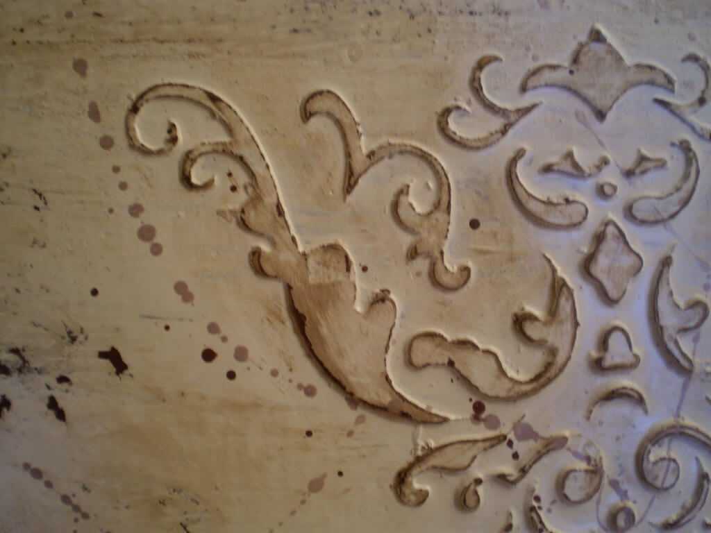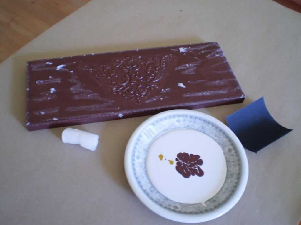 Или другой вариант: после высыхания декоративного элемента покрасить поверхность коричневой акриловой краской, затем натереть свечой сам узор и поверхность рядом с ним.