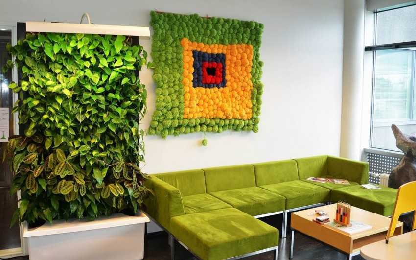 На фото стена из живых растений в гостиной, выполненной в эко-стиле.