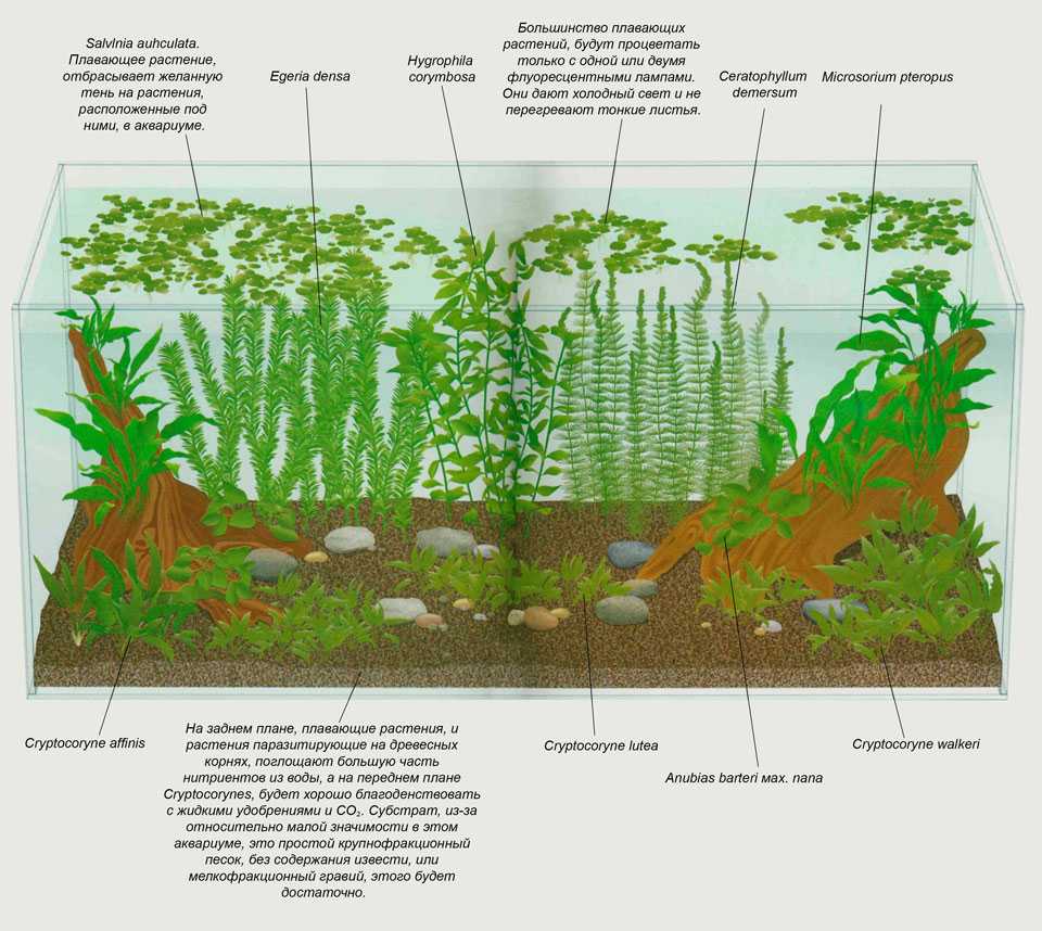 В размещении растений в аквариуме рекомендуется соблюдать такие принципы: