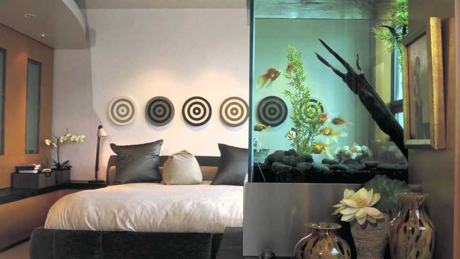 Наличие аквариума в спальне не всегда уместно, так как он может повышать уровень влажности в помещении. Помимо этого, данный элемент подсвечивается и фильтрует воду, что добавляет лишний шум и свет в комнату для сна.