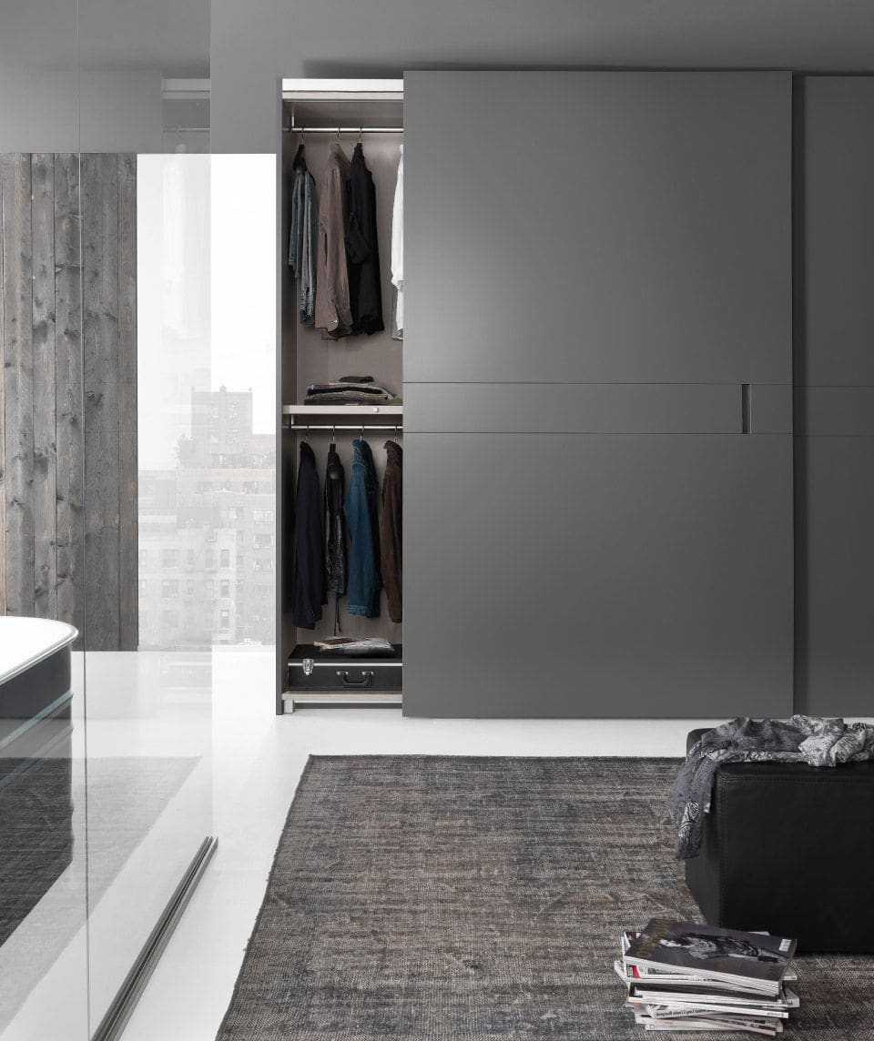 Шкаф-купе с большими створками глухой серой покраски отлично впишется в скандинавский стиль интерьера