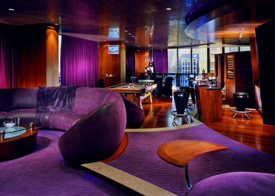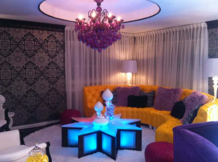 - Фиолетовый используется, как преобладающий основной цвет. Покраска стен, полового покрытия, потолка, даже шторы оформляются в этой гамме, остальные мелкие предметы используются в спокойных или контрастных тонах.