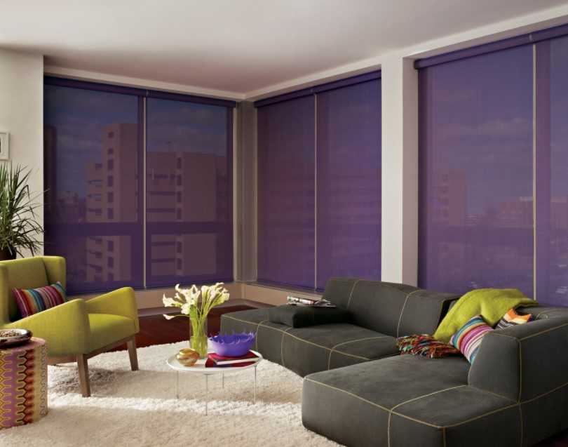 Лиловый, лавандовый или темно-фиолетовый оттенок обивки мягкой мебели в сочетании с синими ковром и шторами способны создать мрачную атмосферу в помещении. Синие тона усилят и усугубят загадочность и некоторую опасность фиолетового цвета. Поэтому при желании использовать именно синий цвет в сочетании с фиолетовым, добавьте к этой холодной гамме пастельных оттенков и тогда ваш интерьер получит право на существование.
