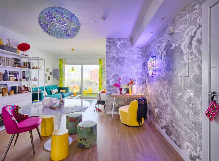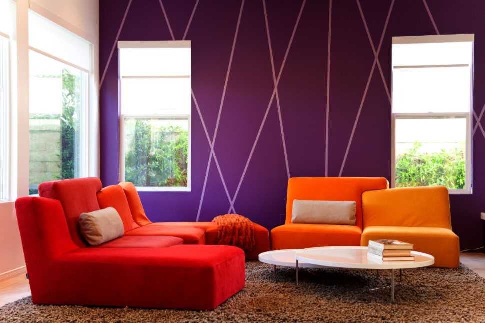 - Современный стиль – это широкое понятие для оформления квартиры в свободном стиле. В этой стилистике частое сочетание фиолетовый с желтым и фиолетовый с зеленым без нанесения узоров и орнаментов;