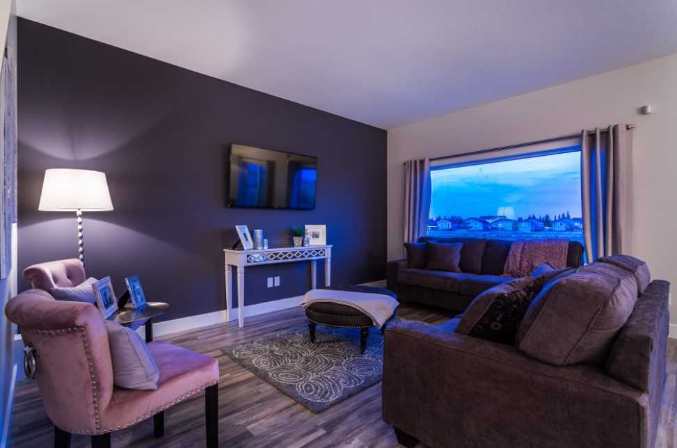 Повесьте шторы, поместите на пол ковер, акцентируйте внимание на светильниках и прочее. Чем больше светлых акцентов будет сделано, тем живее станет фиолетовый