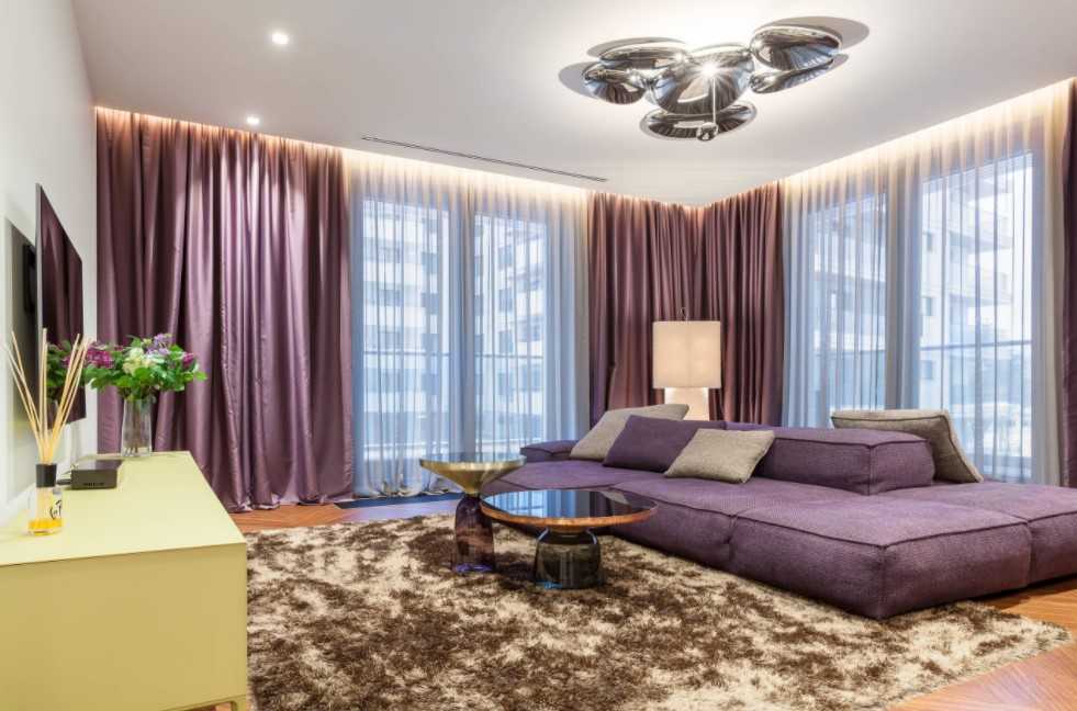 Цвет требователен к другим сочетаниям и материалам, но при этом любую обстановку делает более одухотворенной и спокойной. Начинать ее оформление лучше с центра мебельной композиции — дивана фиолетового оттенка, выстраивая вокруг него оттеняющие слои и расставляя акценты.