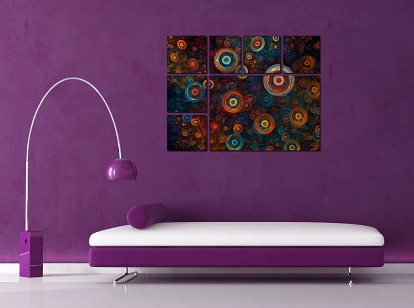 Фиолетовые панно и диван в интерьере столовой-гостиной