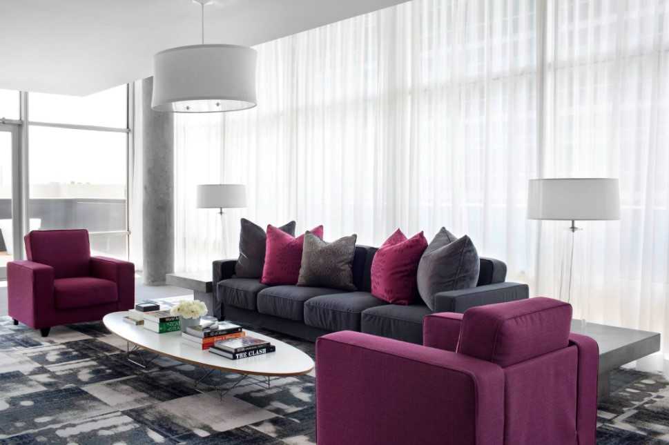 Необычные дуэты характерны для современных стилей, в то время как в классике пурпурный будет сочетаться скорее с белым, серым, бежевым. Но в таких направлениях, как минимализм, сама палитра помещения будет декором, поэтому в этом дизайне применимы яркие привлекательные цвета