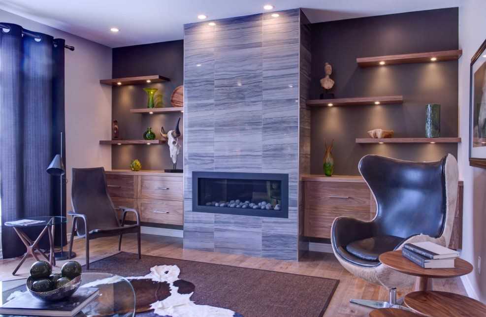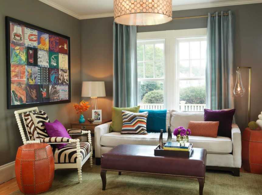 Подобное решение позволит сгладить нотки агрессивности фиолетового, в результате чего гостиная наполнится спокойствием. Это может быть тандем насыщенного фиолетового с лаконичным светло серым либо, наоборот, сочетание оттенка мокрого асфальта с бледным фиолетовым. Главное не создавать ощущение размытости границ между используемыми тонами. В противном случае серая гамма возьмёт верх, а гостиная потеряет привлекательность.