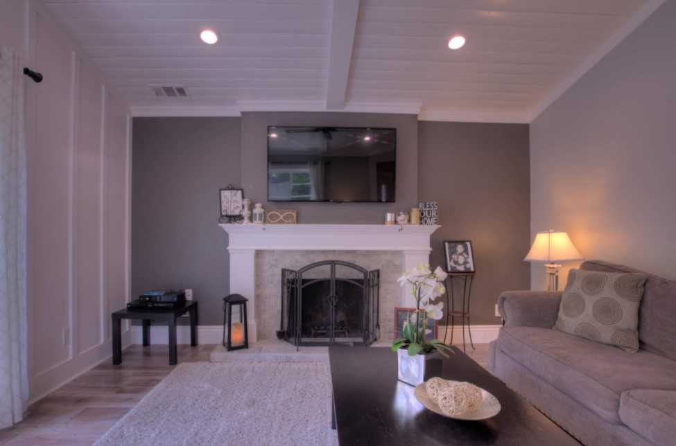 На фото сдержанная гостиная с угловым диваном серого цвета.