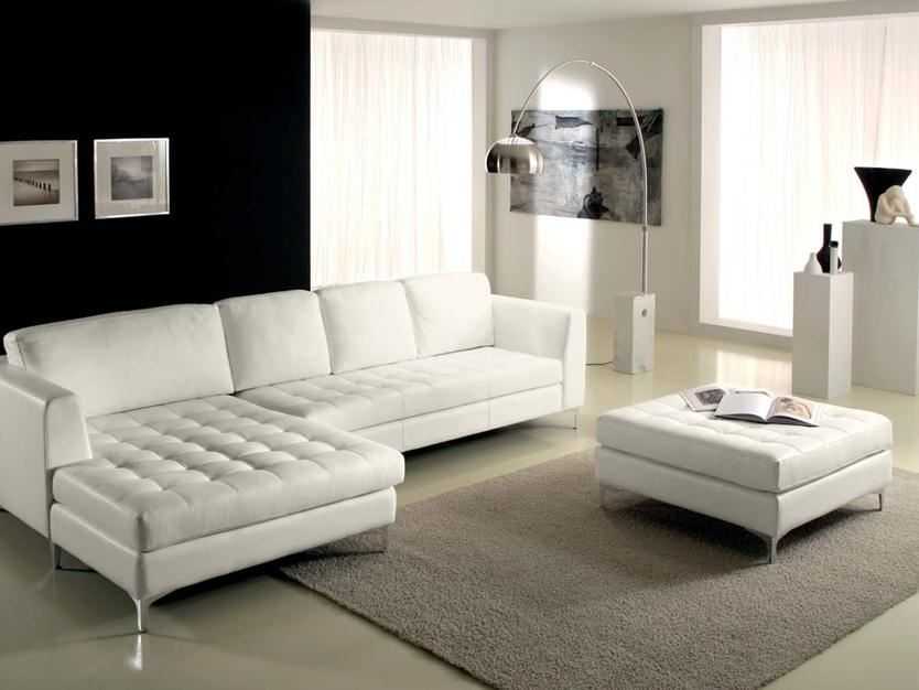 На фото стильная гостиная с диваном белого цвета. Зона отдыха дополнена пуфиками с кожаной обивкой.