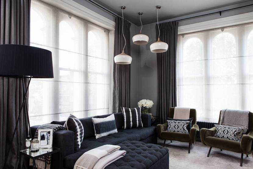 Черная кожаная мебель и оконный текстиль для гостиной