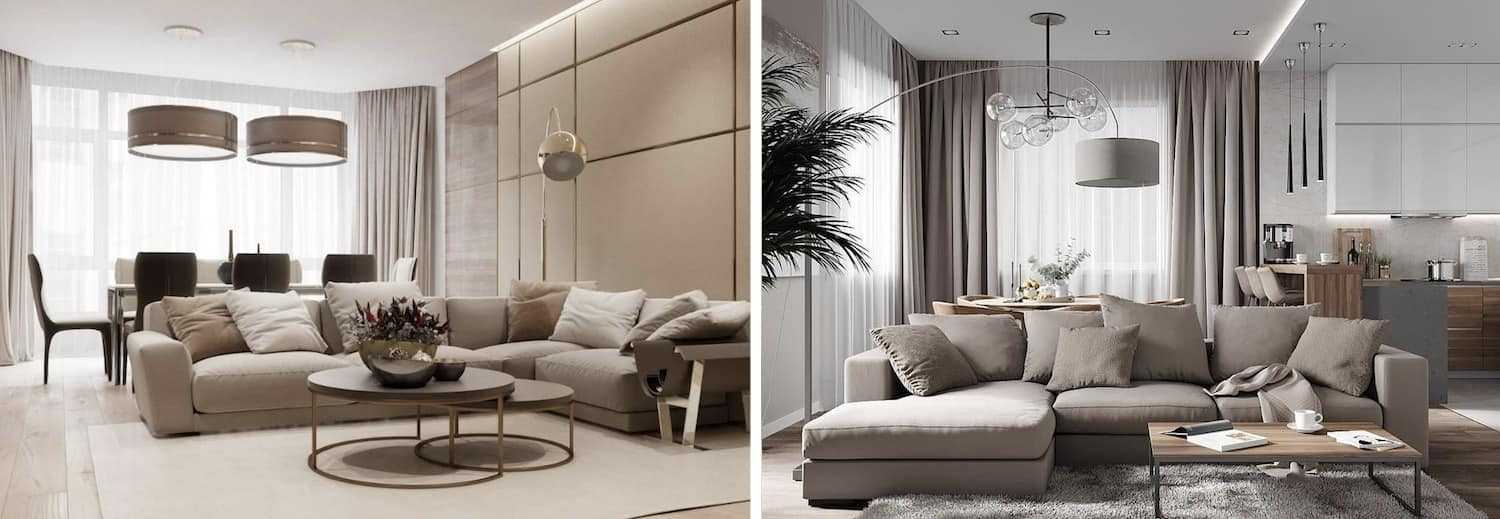 - Бежевый, серый, молочный — база, которую можно использовать в любом интерьере: от хай-тек до скандинавского стиля.