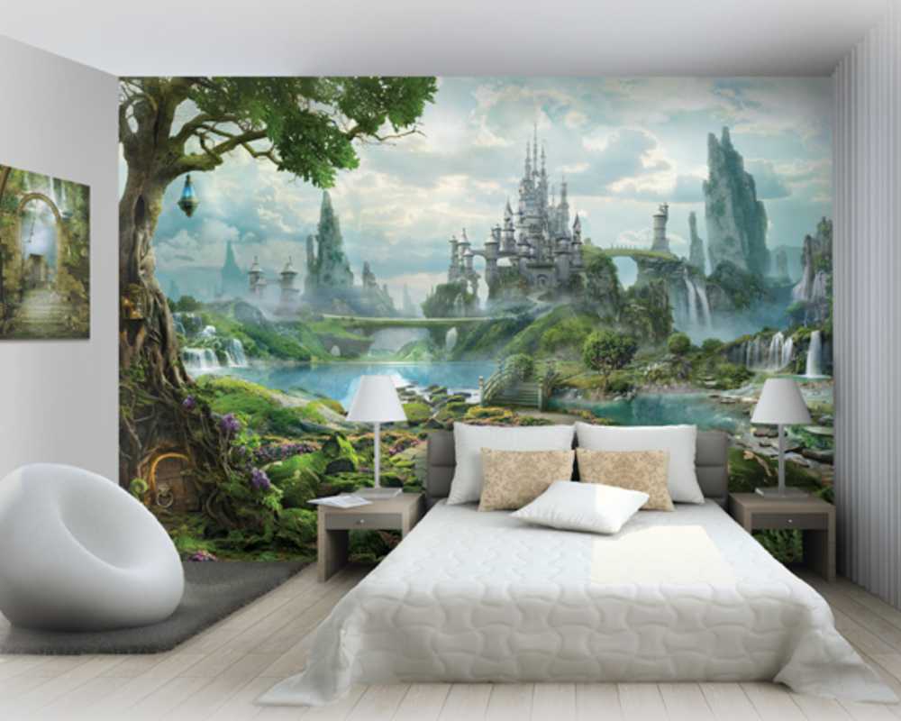 Для лучшего восприятия не стоит вешать на стены с фотопринтом дополнительный декор в виде картин или фотографий. Такое настенное покрытие в дополнительном украшении не нуждается.