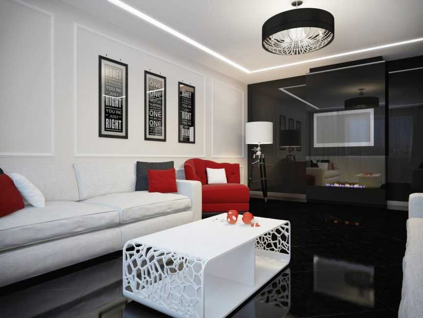 Для малогабаритной гостиной лучше выбрать аккуратный и элегантный светильник без лишнего декора. В вытянутой и узкой комнате будет уместно симметричное размещение двух небольших световых источников.