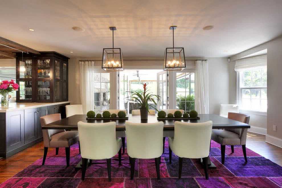 Важно подобрать размер покрытия — убедитесь, что вы легко можете придвигать и отодвигать стулья, не задевая края ковра. В этом случае он довольно быстро потеряет внешний вид