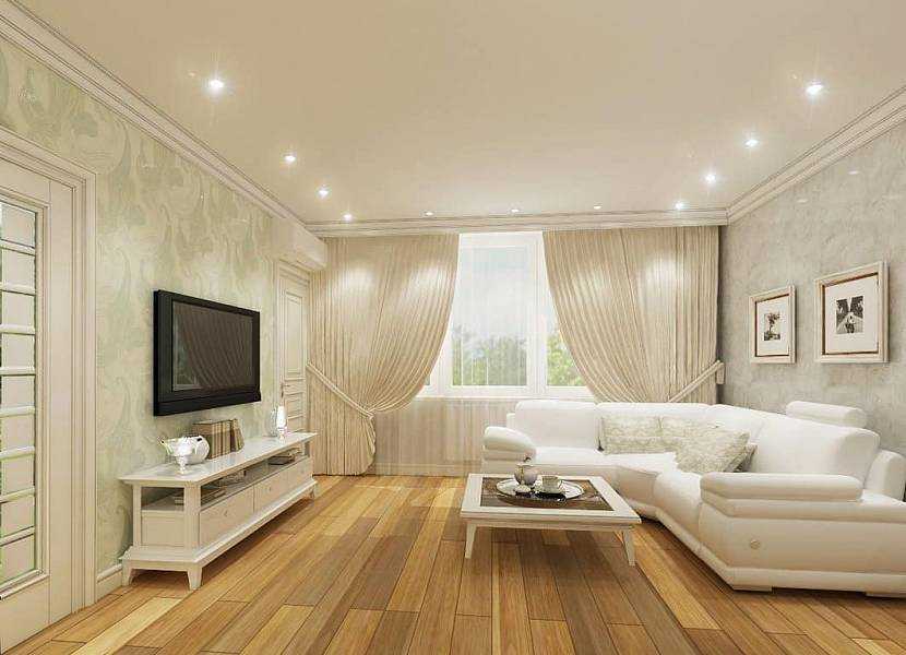 - 2 ряда точечных источников света вдоль более короткой стены, позволят зрительно исправить пропорции комнаты.