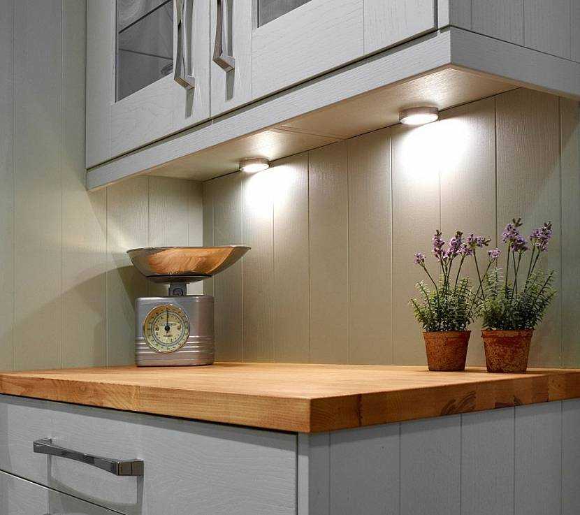 Приборы бывают разного размера и мощности, обеспечивают локальное освещение. Количество рассчитывается исходя их площади кухни.