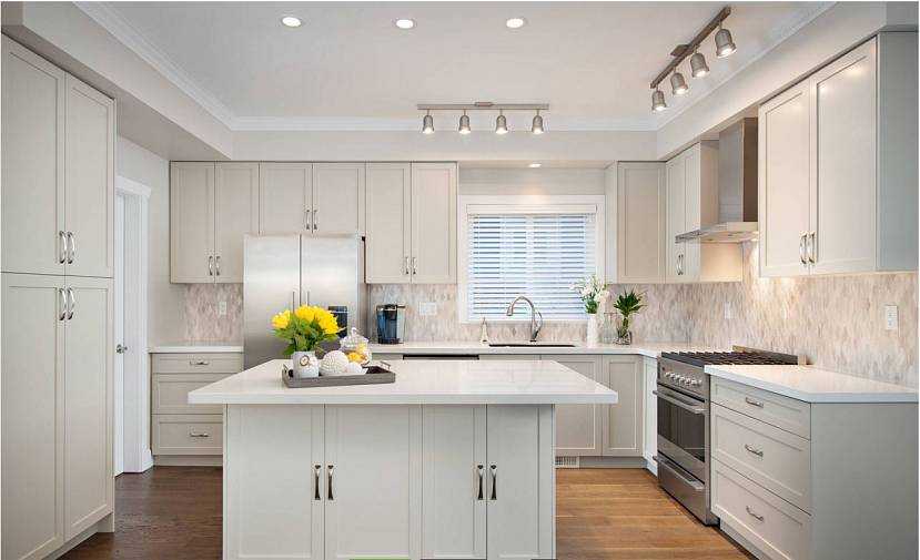 Кухня. Споты здесь обеспечивают достаточную освещенность и служат универсальным инструментом для зонирования. Они позволяют визуально изменить пропорции комнаты.