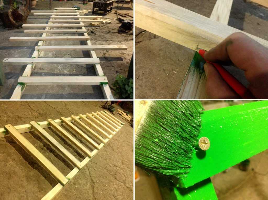 4. Переходим к сборке. Для этого сначала опоры в местах зарубки выкрасите в яркий цвет (в нашем примере это зеленый). Установите верхнюю и нижнюю ступеньки на опоры в пазы, при перекосах выровняйте всю конструкцию. Высверлите соответствующие отверстия в местах зарубок и закрепите ступени при помощи саморезов.
