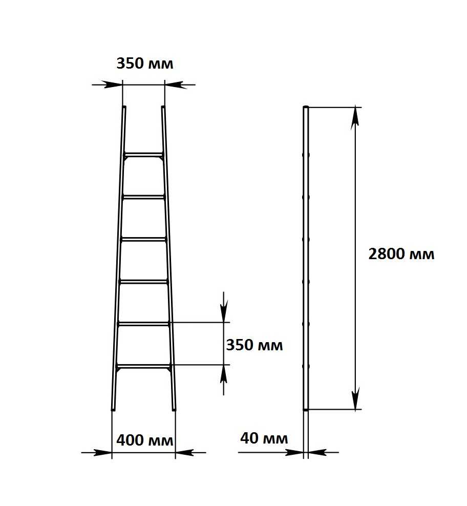 Приставная лестница должна быть спроектирована таким образом, чтобы ее низ был немного шире верхней части. Оптимальное расстояние между тетивами внизу 40 см, вверху – 30 см.