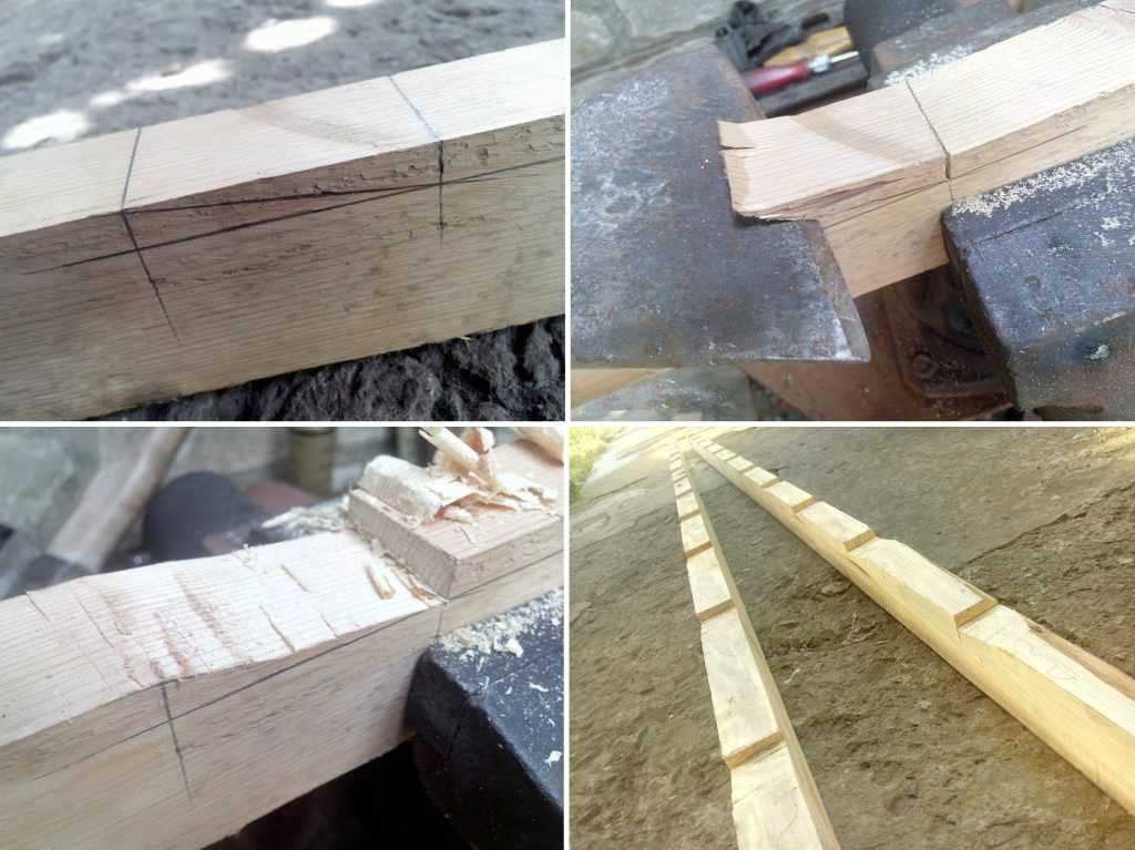 1. На опорных брусках нужно сделать метки – места крепления ступеней. Размер пазов соответствует ширине ступенек, например, 50 мм. Аналогичные метки делаем на боковых гранях – это будет зарубка, ее глубина должна быть 15-20 мм. По намеченным линиям выполняем паз с помощью топорика, полученный скос при необходимости подравниваем и шлифуем.
