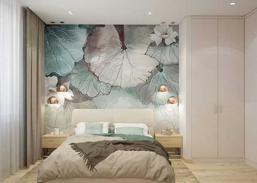 Природные мотивы. Особенно красиво такие полтона смотрятся благодаря естественности изображения, глубине цвета на рисунке. Тем более если речь идёт о фотообоях. Если же работаем просто с растительными и природными орнаментами (цветы, ветки растений, фигуры животных), то они вообще отлично подходят оформлению спальни.