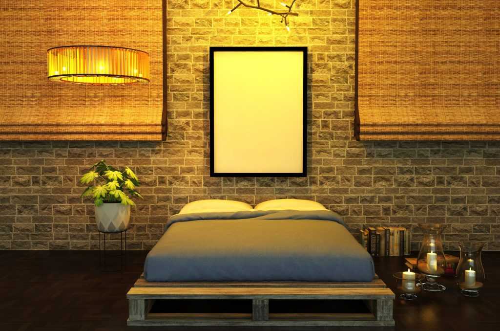 - Оформление спальной комнаты в стиле лофт (необработанные кирпичные стены, потолочные балки из бруса при наличии высоких потолков, отделка с помощью искусственно состаренных досок, граффити).