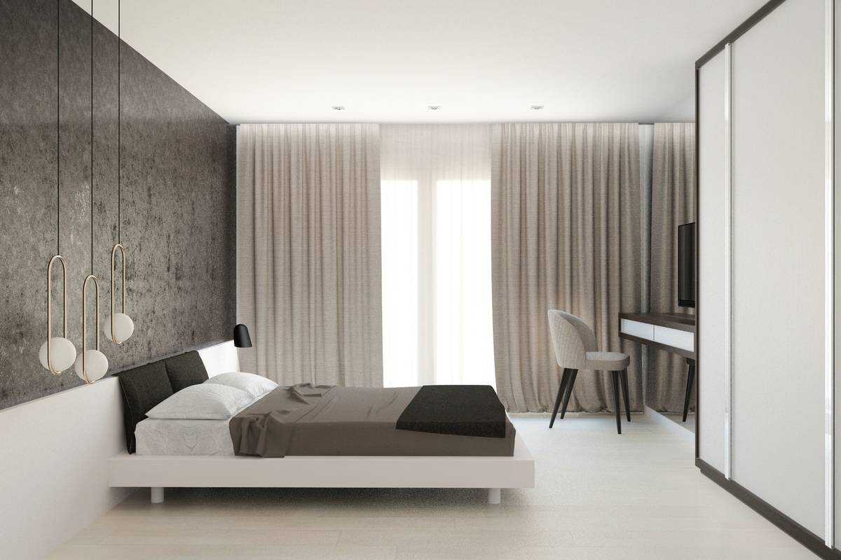 Спальню оформляют в нейтральных тонах. Обычно главным становится белый цвет, и к нему уже добавляют бежевый, черный, серый. Яркость дают фиолетовые, черные и красные аксессуары. Стены оклеивают однотонными обоями, пол укладывают линолеумом с ненавязчивым узором, ковролином либо виниловой плиткой.