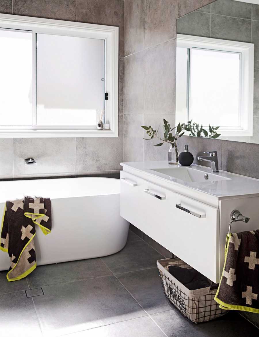 Например, белоснежная ванная выглядит очень эффектно, но в силу того, что на белом видны малейшие загрязнения, не очень практична. Высоко расположенные полки, наличие большого количества стеклянных поверхностей и острых углов не будет безопасным для детей.