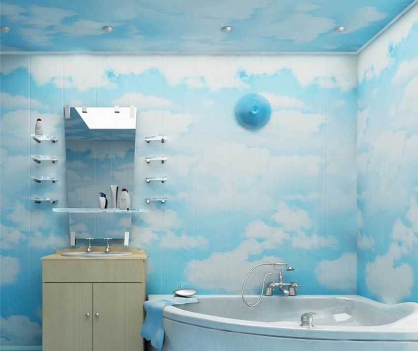 - Потолок целесообразно выполнять в классическом белом цвете. Допускается установка влагостойких натяжных конструкций. Наиболее подходящим материалом для условий с повышенной влажностью является поливинилхлорид. Он не подвержен заселению плесени, легко моется, при необходимости защитит от протечки сверху.
