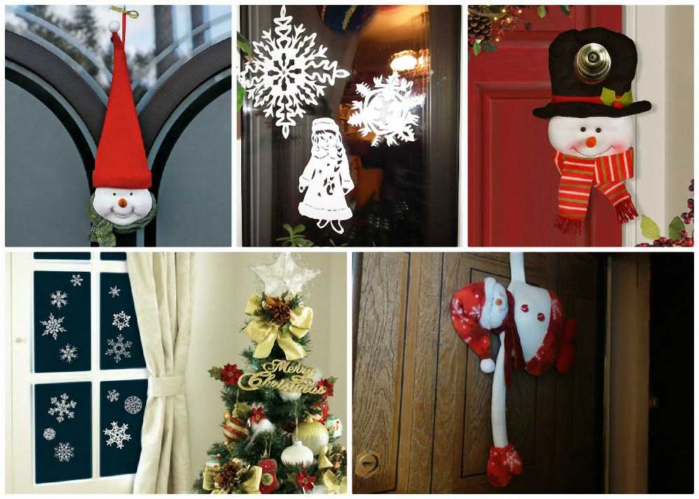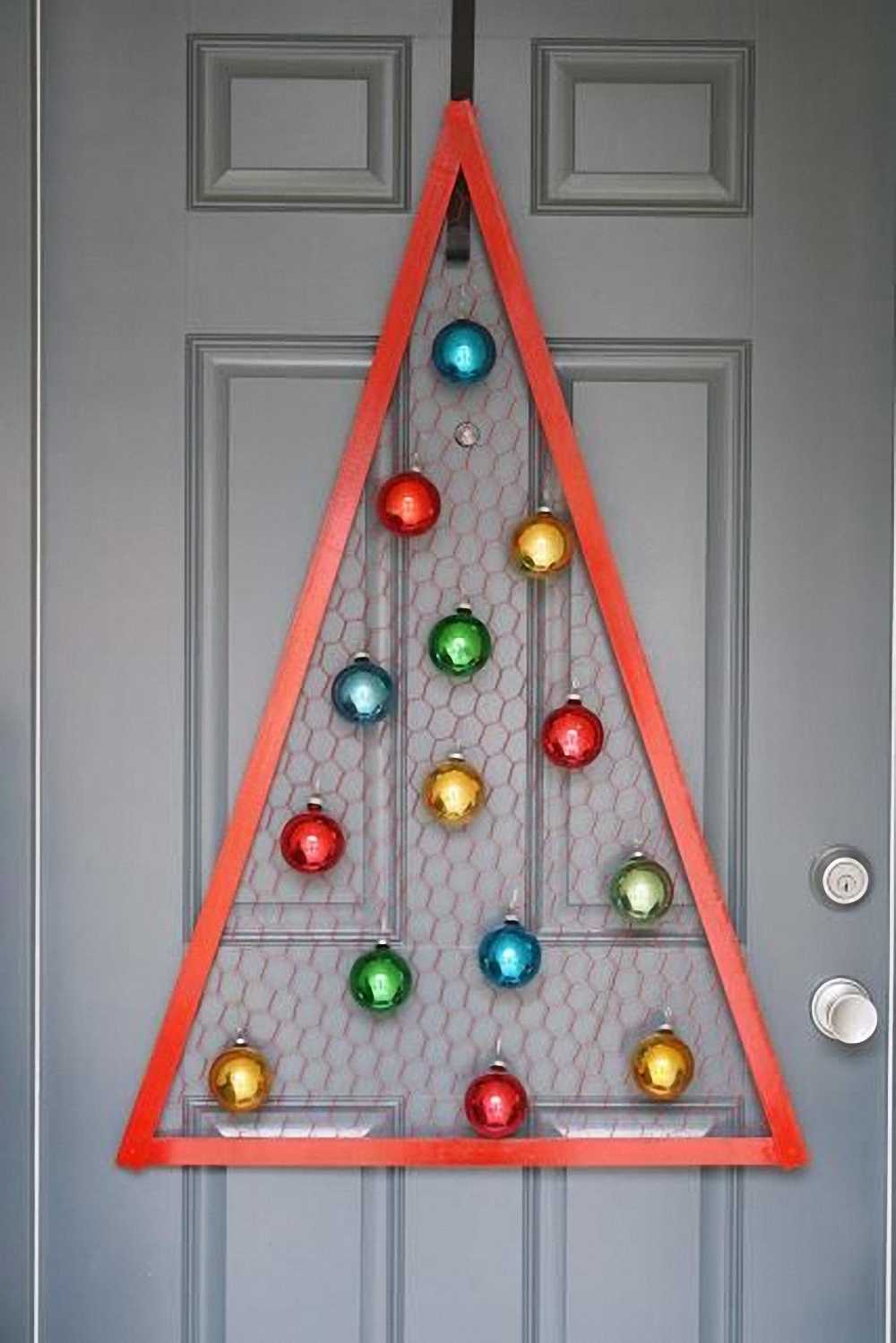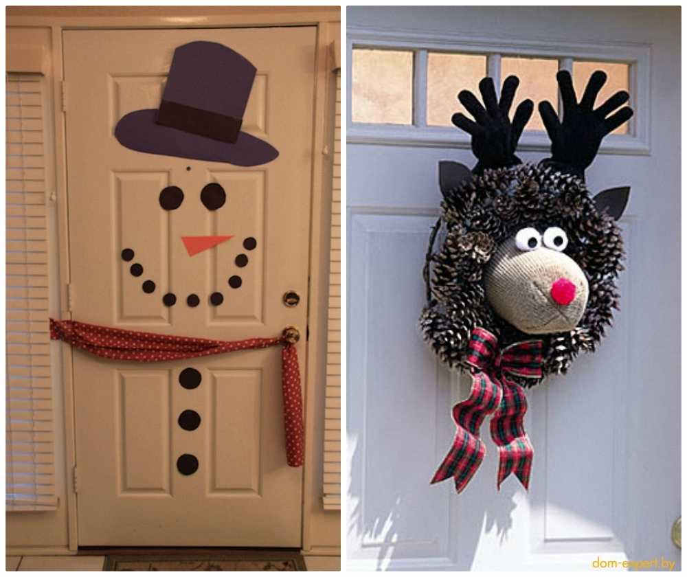 Для украшения двери используйте елочные игрушки только из пластика, иначе высока вероятность разбить их и поранить ребенка.
