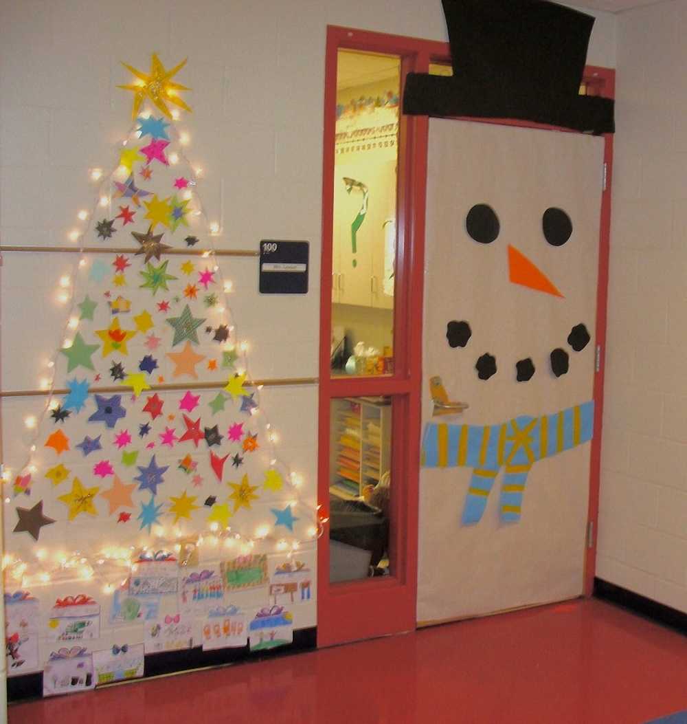 Украшая дверь в группу, учитывайте ее цвет. Если она белая, то ее легко можно дополнить снеговиком из ваты или гирлянд.