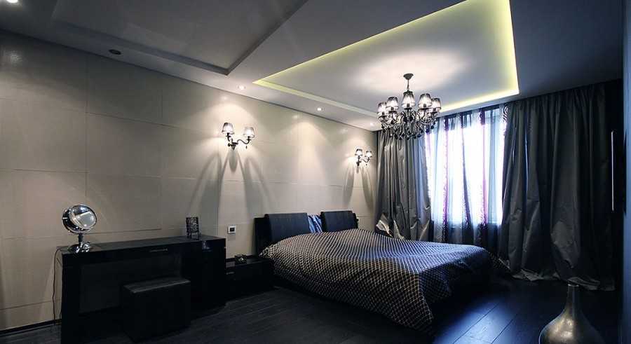 В дизайне малогабаритной 3-комнатной квартиры выстроена интересная световая схема: под карнизами — подсветка, яркое освещение у туалетного столика, светильники у кровати и общее мягкое освещение с помощью встроенных в потолок светильников.