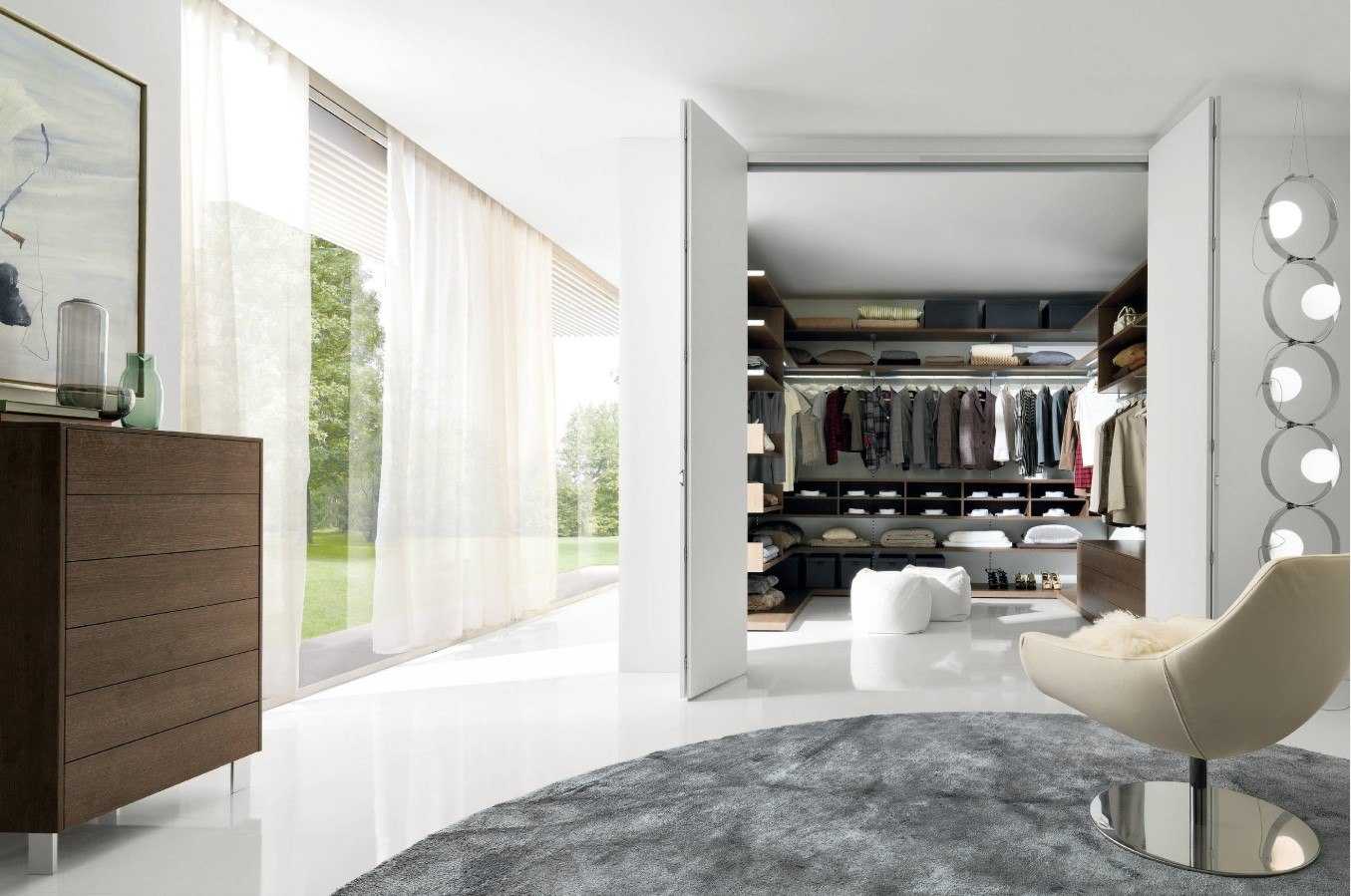 Чаще всего гардеробную комнату оборудуют в спальне. Такое решение позволяет избавить квартиру от большого количества мебели. Ведь все вещи перемещаются в одно место. Вся одежда распределена по полкам. Таким образом, создается система для комфортного хранения.
