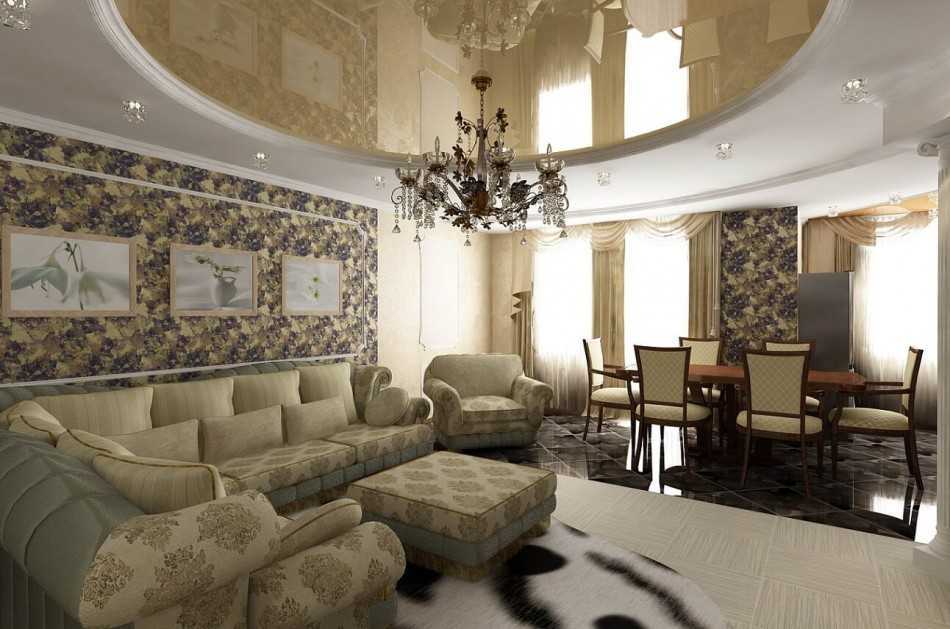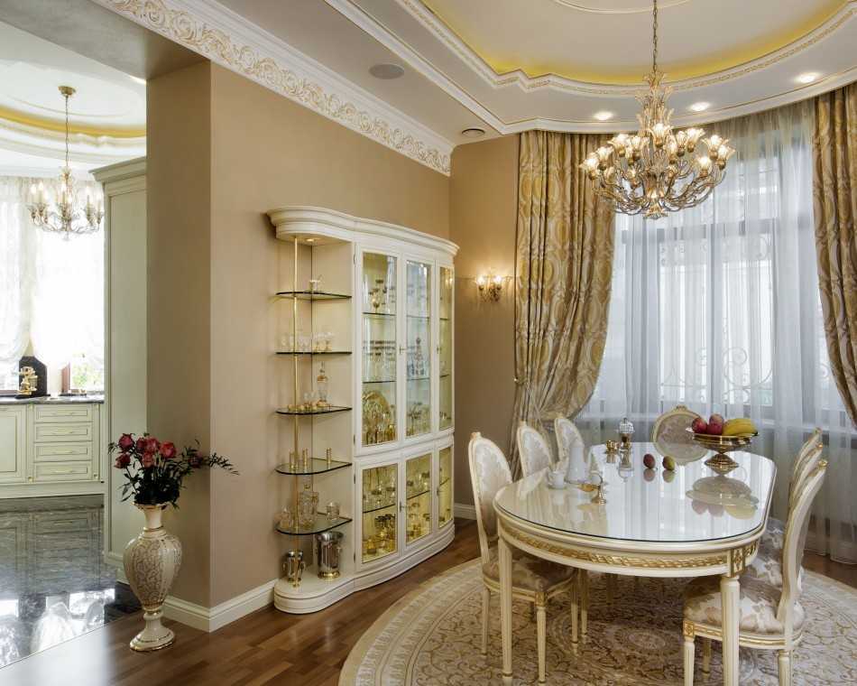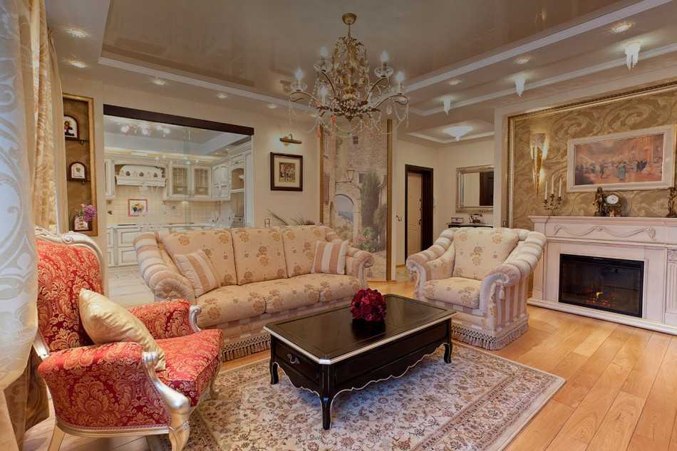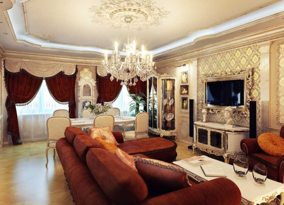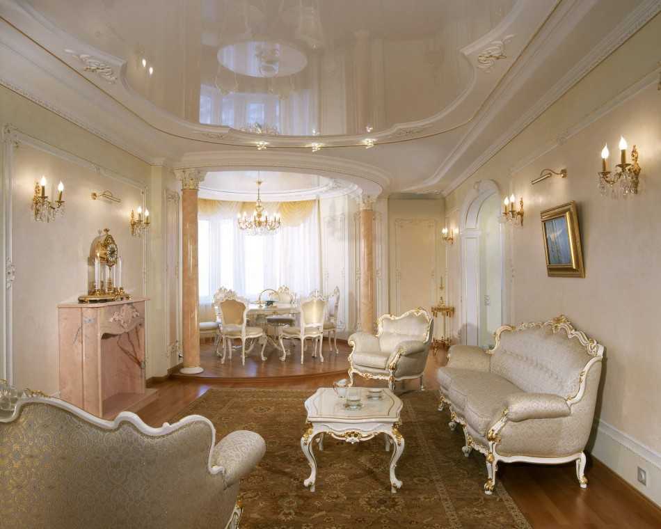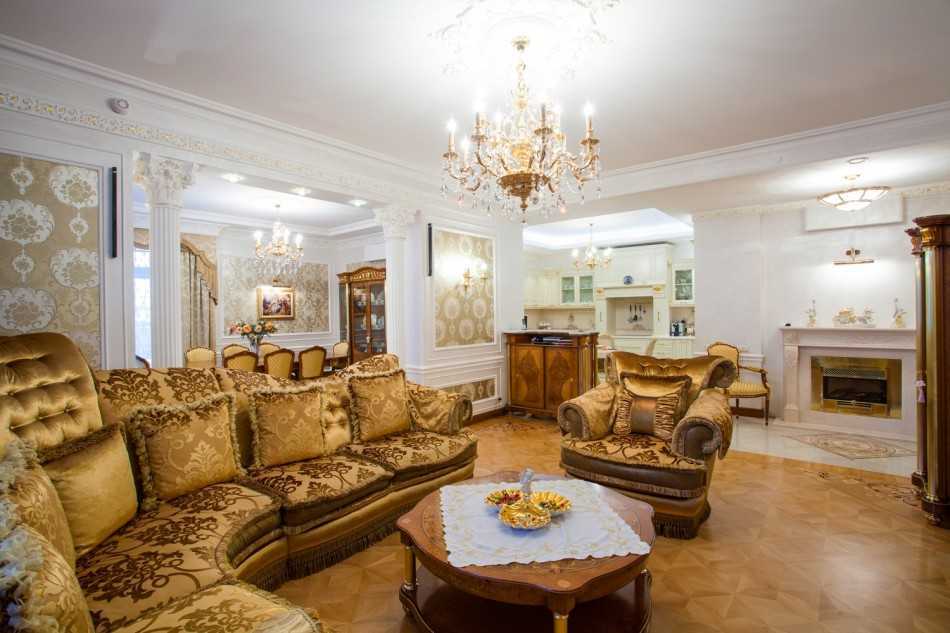 В гостиной можно создать ощущение праздника и торжественной роскоши с помощью позолоты, колонн и лепнины.