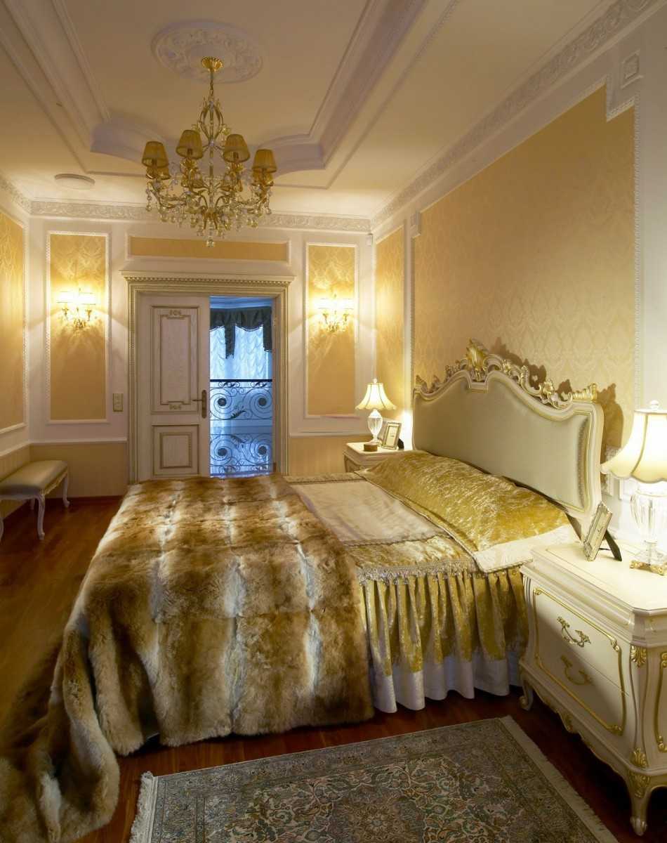Для спальни подойдет туалетный столик с резными золочеными ножками, большим зеркалом и необычной рамой, подсвечники можно расположить по бокам. У кровати чаще изголовье с позолотой и оригинальной формы. Красиво будут смотреться овальные зеркала.