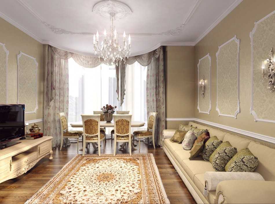 На фото хорошо видно, что классический дизайн отличает помпезность, строгость, торжественность. Такое оформление отлично подойдет пространству квартиры в 64 кв. м, наполнит его жизнью и величавой элегантностью.