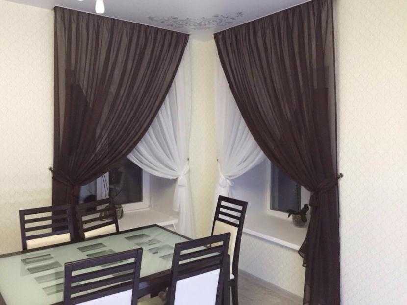 В современном интерьере актуальный вид имеет оконный текстиль в кофейных, шоколадных и каштановых расцветках. Такой декор идеально оттеняется светлой отделкой помещения