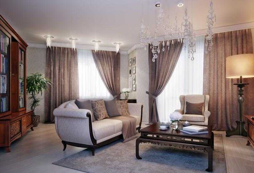 Гостиная. В просторной комнате хорошо смотрятся портьеры любого коричневого тона; их выбирают в тон или в контраст остальной отделке. Если гостиная небольшая, выбирают светло-коричневый или бежевый, с коричневым рисунком, вариант. При выборе обязательно учитывают общее интерьерное оформление.