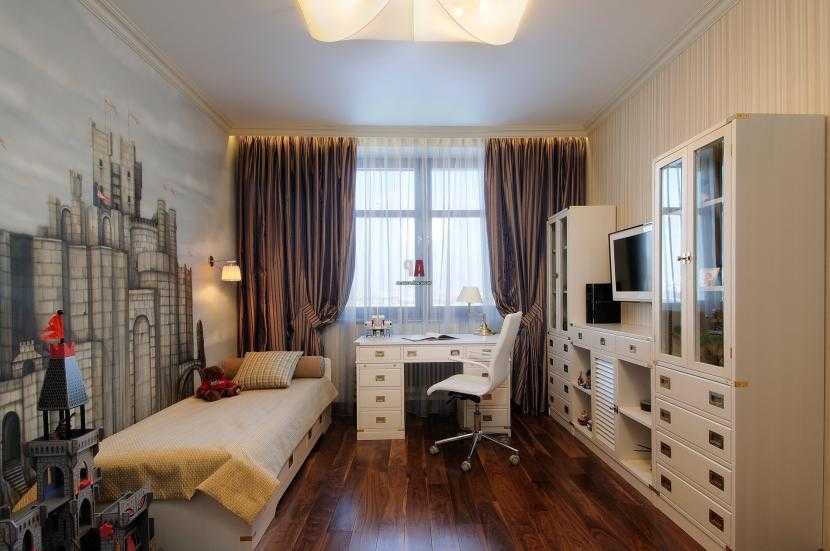 Детская. Оптимальный способ украсить комнату малыша – повесить укороченные портьеры светло-коричневого или песочного цвета. Они не обязательно должны быть однотонными; привлекательным сочетанием станет светлый текстиль с шоколадным узором.