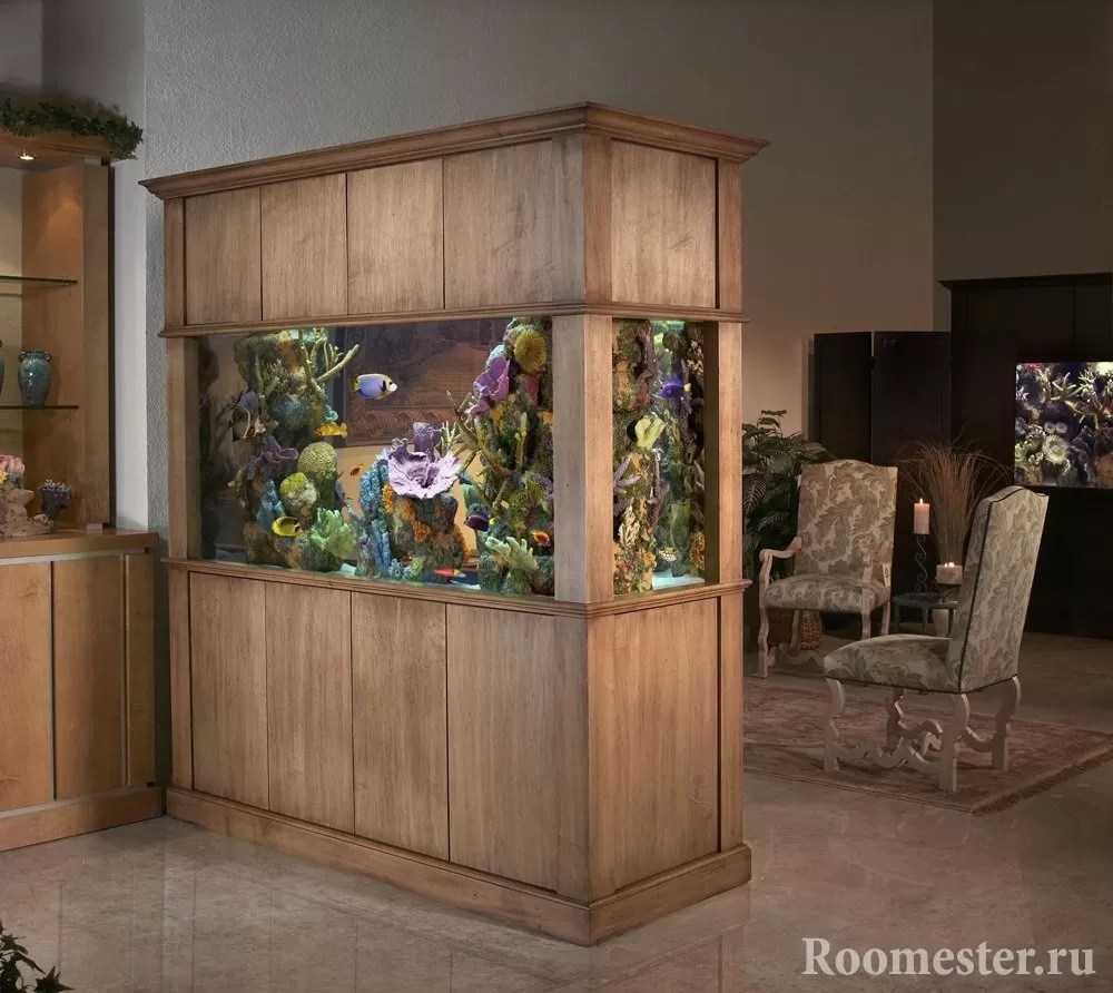 - Вмонтированный в декоративную перегородку – разновидность представляет собой разделитель пространства в виде резервуара с рыбами. Аквариумы в виде перегородок не урезают помещение, а создают визуальное расширение комнаты. Перед установкой следует предусмотреть наличие пространства над резервуаром, равное половине объема емкости для ухода.