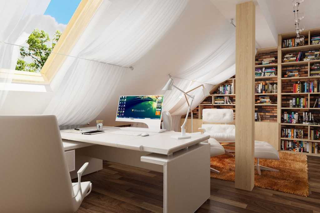 При планировке рабочего кабинета на мансардном этаже стол лучше всего разместить у окна, а вдоль скошенных стен разместить стеллажи для документов и книг. Также можно поставить мягкий диван, столик с чайным сервизом и можно будет принимать посетителей. Для кабинета требуется не так много места, поэтому такой вариант подходит даже для маленькой мансарды.
