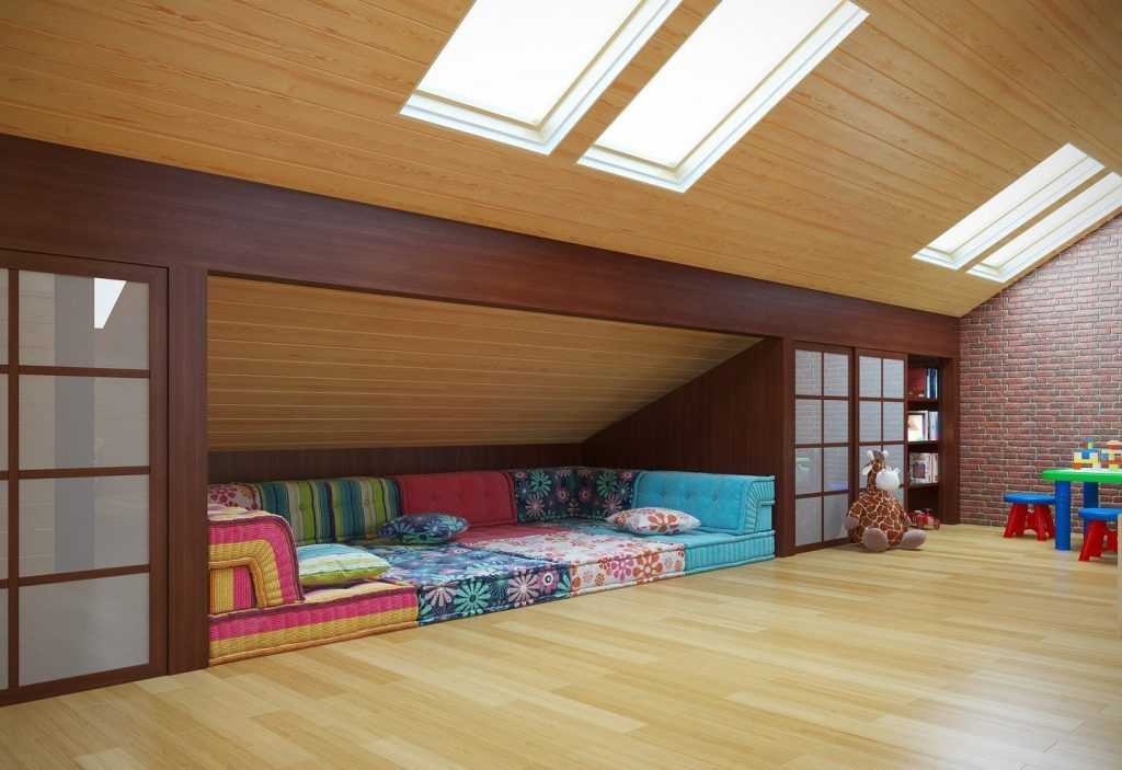В этом случае не должно быть большого количества перегородок, иначе помещение будет казаться маленьким. Мансарду лучше разбить на зоны с помощью красивых и в то же время функциональных стеллажей, штор или ширм, также помогут стены, покрашенные в разные цвета, ковры, шторы и другие приятные мелочи.