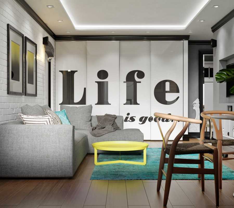 Небольшая площадь комнат, как правило, требует покраски стен в светлые тона. Однако это не означает, что одну из поверхностей нельзя выполнить в другом цвете. Акцентная стена – распространенное решение для гостиной в двухкомнатном жилище. А также можно применить еще один дизайнерский прием – сделать одну из поверхностей рельефной. В этом случае фактурная стена окрашивается в тот же цвет, что и другие.