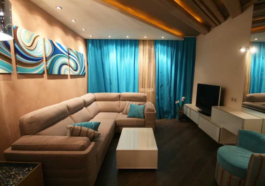 цветовая гамма: классический подход для тесных помещений – светлые тона. Но если для спальни больше подойдут более теплые (бежевый, песочный) цвета, то для гостиной можно взять и что-то более «прохладное», светлые оттенки зеленого или голубого. Чтобы избежать однообразия, можно сделать одну стену акцентированной или добавить пару ярких элементов