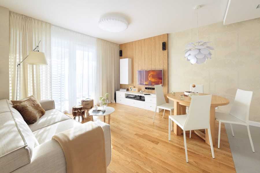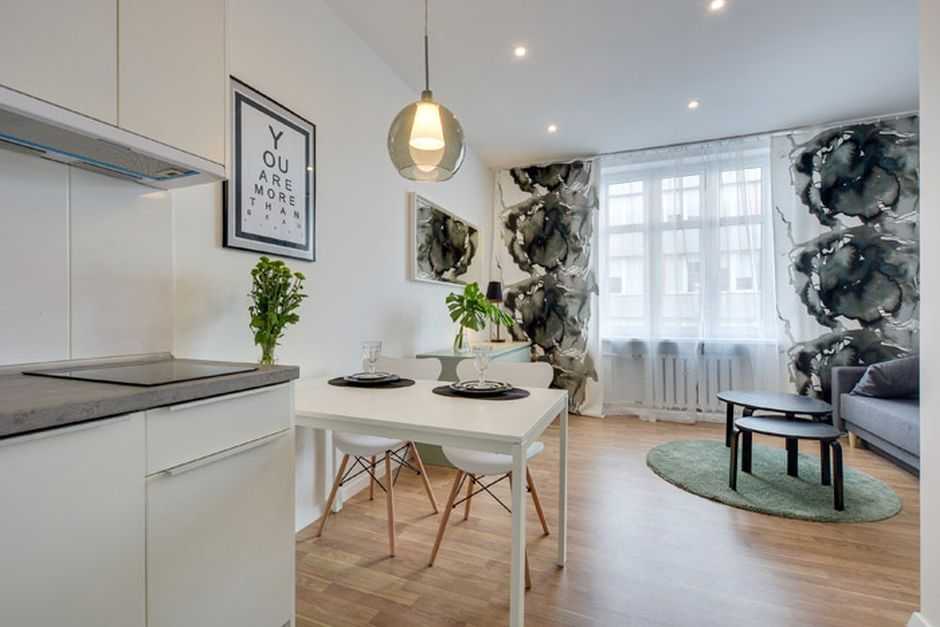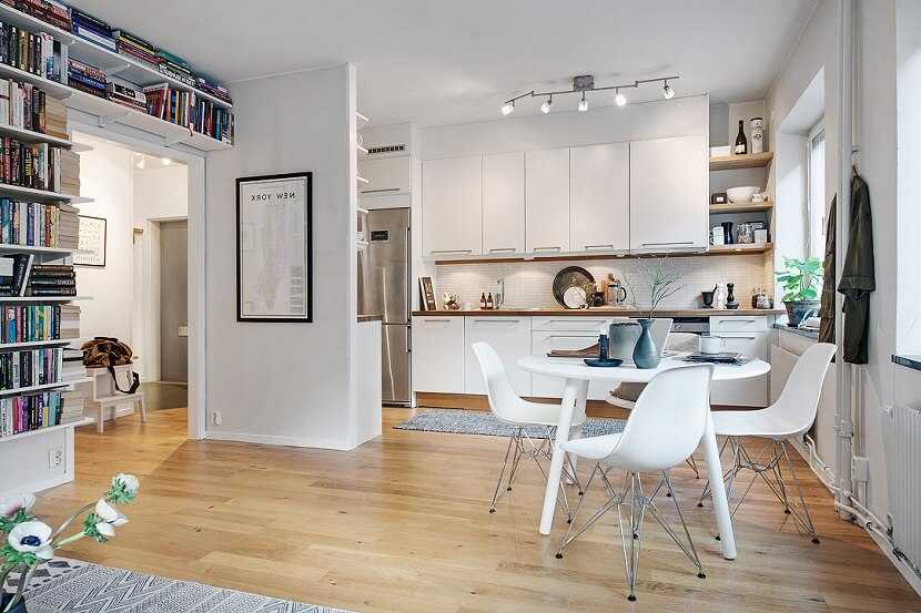 Грамотное зонирование – основополагающий фактор в данном вопросе, такой прием позволяет отделить кухню и вывести обеденную зону.